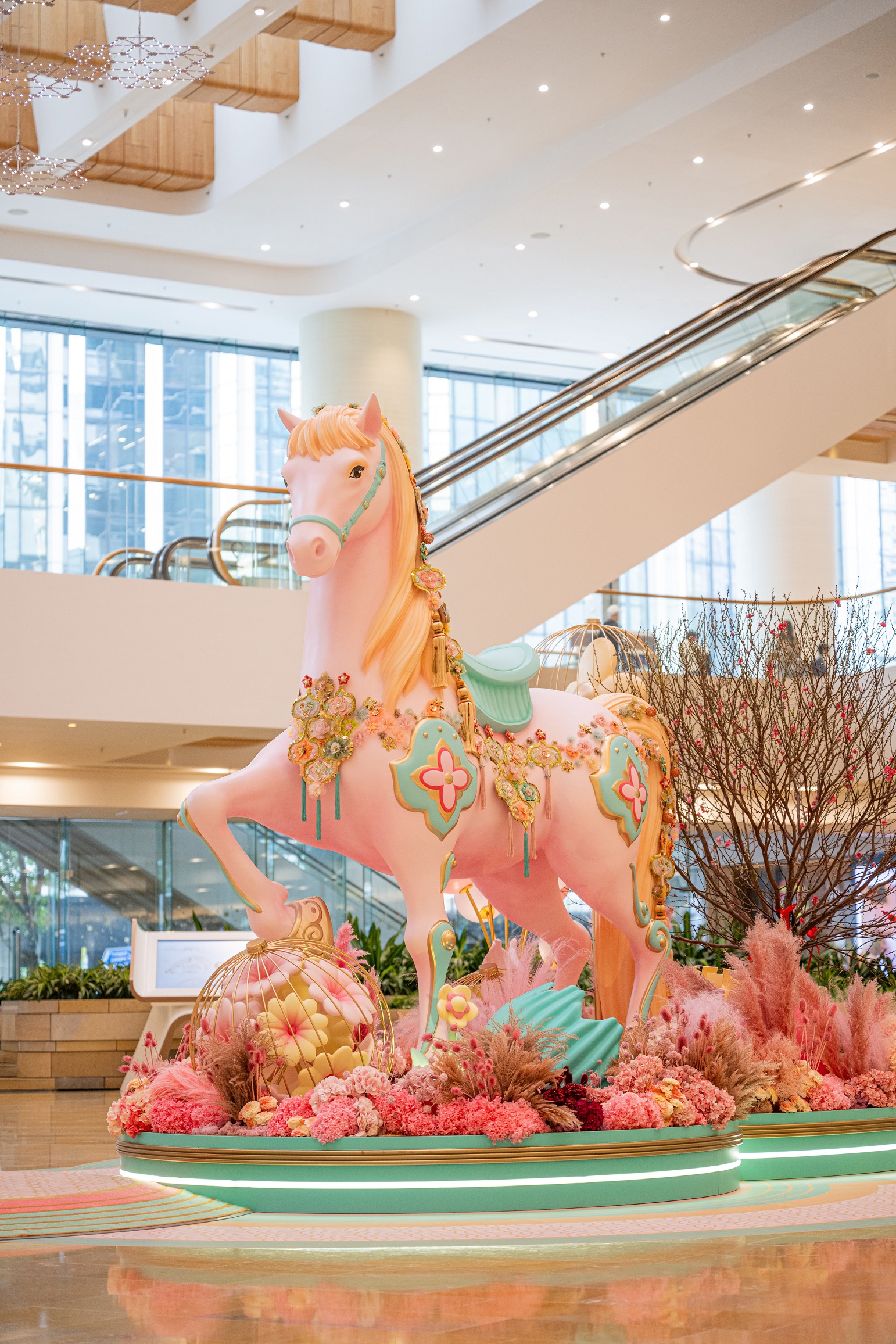 一匹3.5米高的粉彩色巨型骏马配衬花团锦簇与吉祥刺绣,寓意花开富贵,于桃花盛放下蓄势奔向繁盛新岁。